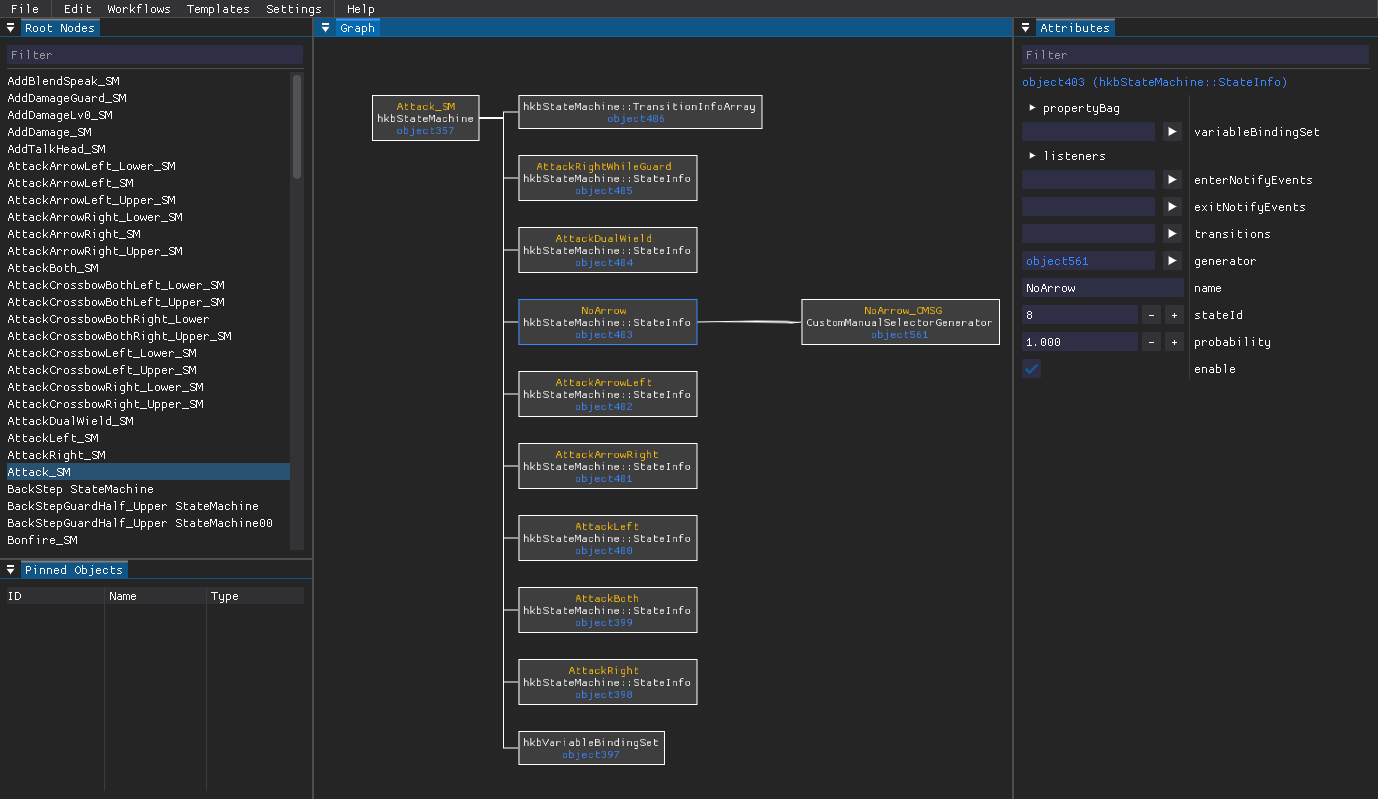 For editing behaviors we'll be using HkbEditor, courtesy of yours truely. Open it and select File -> Open, then navigate to the .xml file you extracted earlier. Depending on the file size this can take a couple of seconds to load.